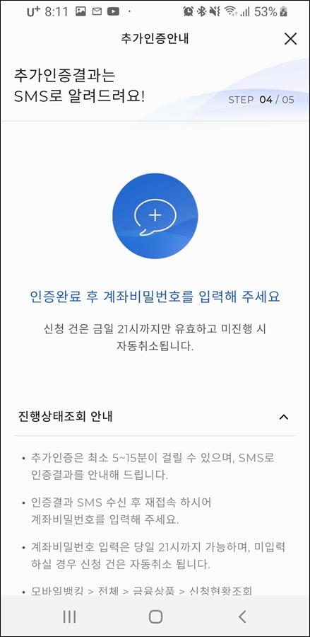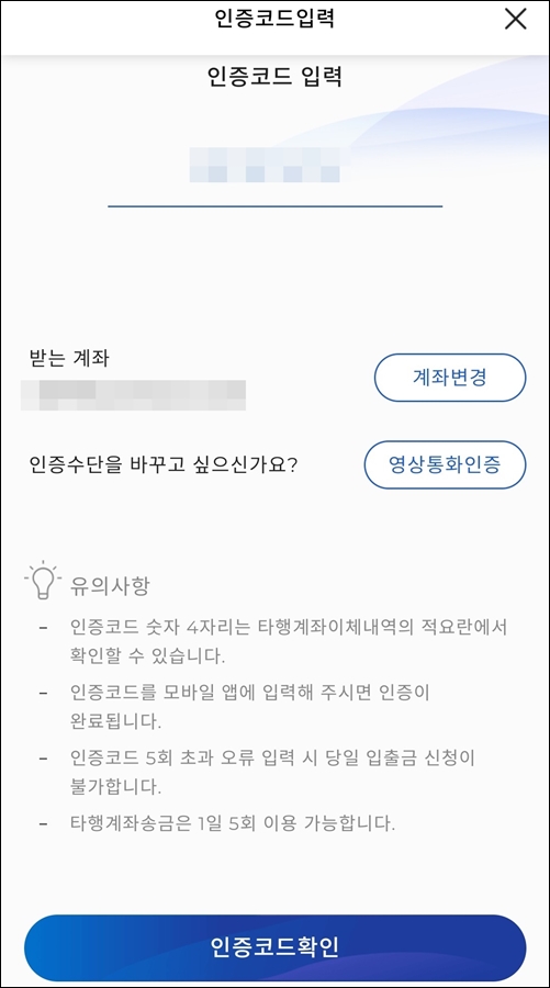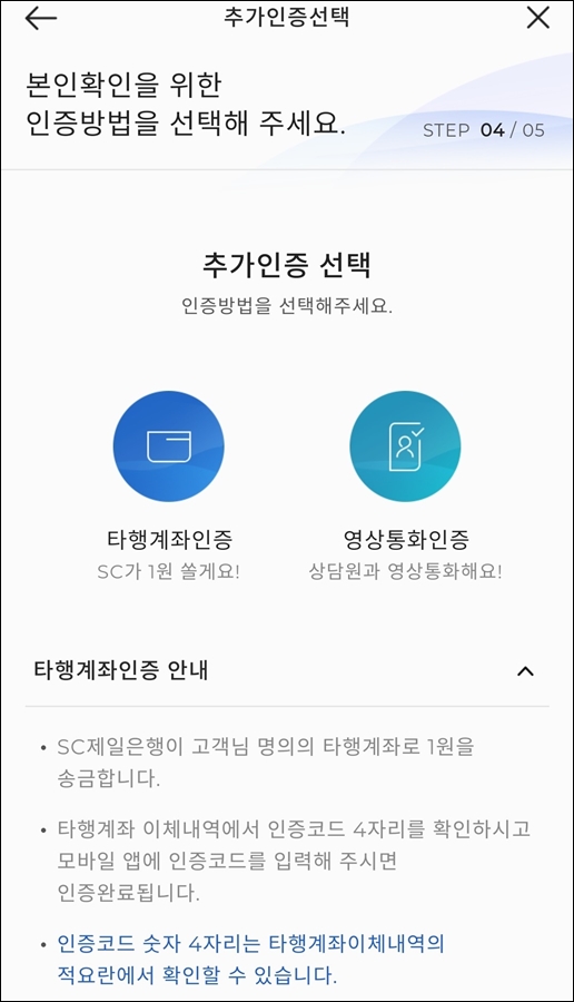 마지막으로 추가 인증 절차를 거치는데, 본인 확인을 위해 꼭 필요한 절차라고 합니다. 위와 같이 타행계좌 인증이나 영상통화 인증 둘 중에 선택하면 되는데 편리한 건 타행 계좌 인증입니다.