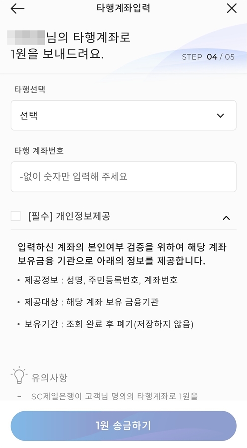 본인 명의로 되어있는 다른 은행의 계좌로 1원을 이체하면서 송금자 정보에 있는 숫자 4자리를 입력해 인증하는 방법인데요, 위와 같이 은행을 선택하고 계좌번호를 입력하면 됩니다.