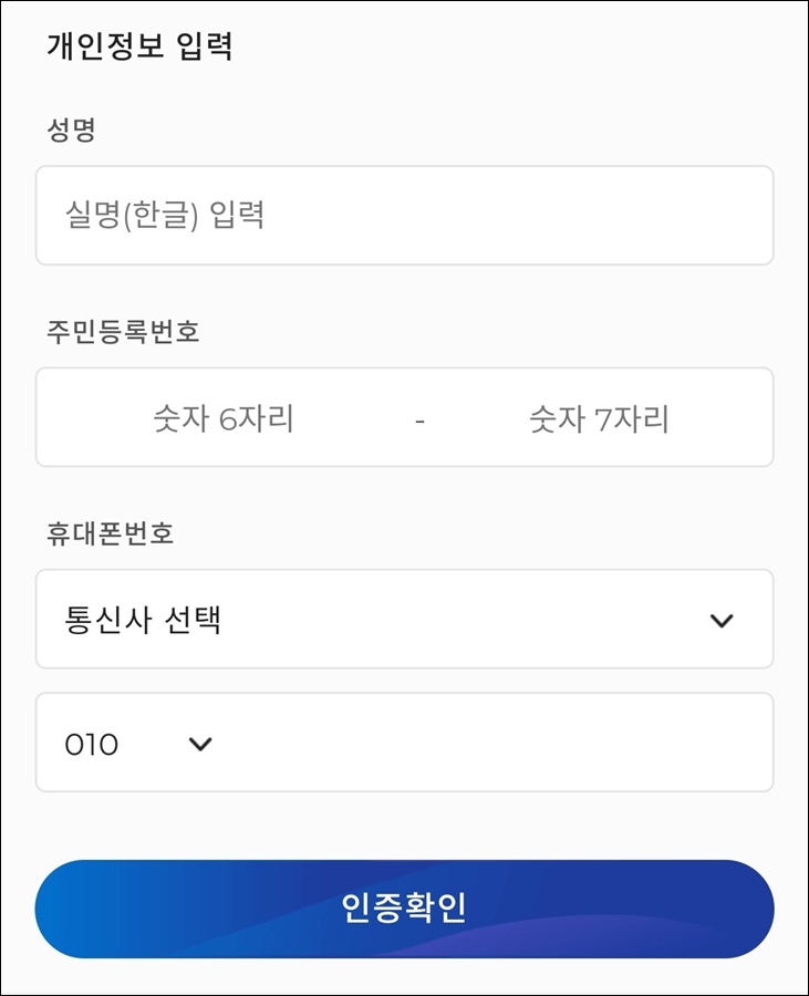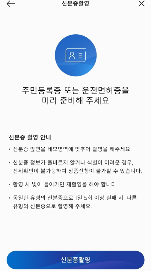 주민등록증이나 운전면허증으로 본인 확인 절차를 거쳐주면 됩니다. 카메라 어플이 실행된 후 실행된 화면 네모에 맞게 신분증을 올려놓고 찍으면 사진 속에 있는 글자 정보를 가져와서 자동 입력을 해줍니다.