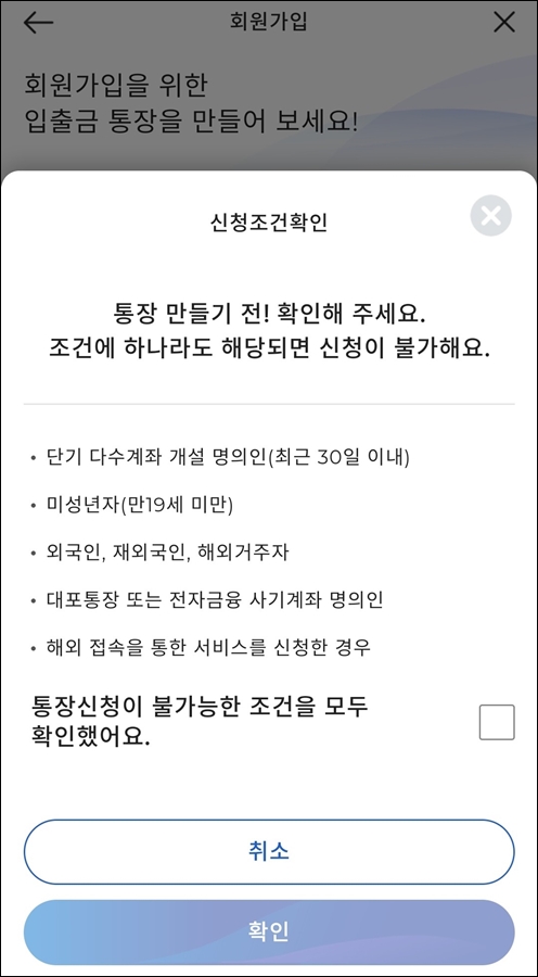 위와 같이 입출금통장을 개설하기 위해 통장신청 불가 조건이 있는지 확인해주세요. 다수계좌나 미성년자, 외국인 등 스탠다드차타드 신규 입출금 통장 개설이 안된다고 합니다.