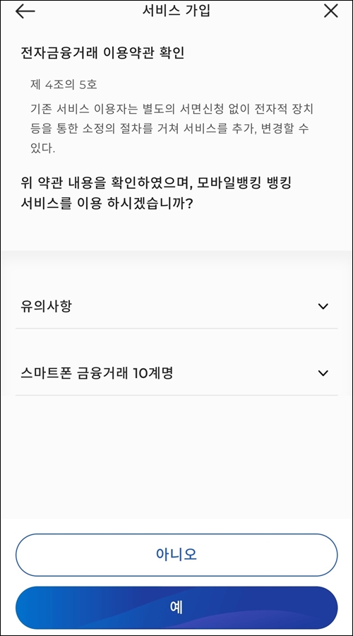 모바일 뱅킹 서비스에 가입하기 위해 간단히 위와 같이 약관 동의 절차를 진행하면 되는데요, 인터넷 뱅킹 가입과 달리 위 약관만 동의하면 모바일 뱅킹 서비스는 신청이 완료됩니다.