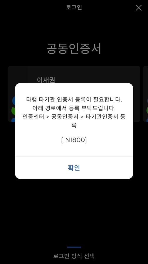 타기관 인증서 등록 메뉴를 선택하여 공동 인증서를 가져와 보도록 합니다.