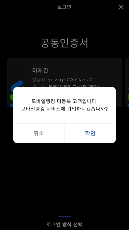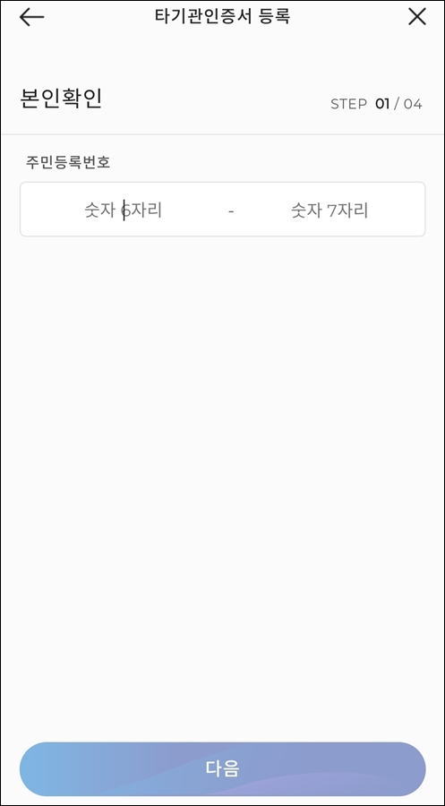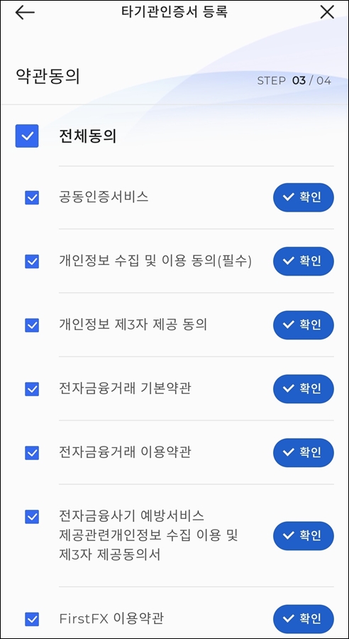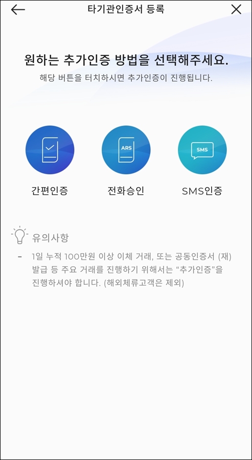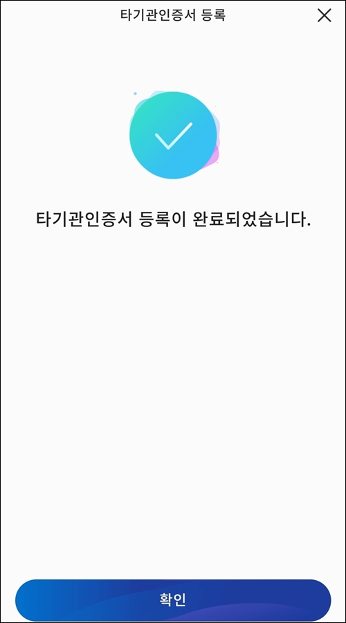 위와 같이 약관에 동의하고 추가 인증을 통해 타기관 인증서 등록을 완료할 수 있습니다.