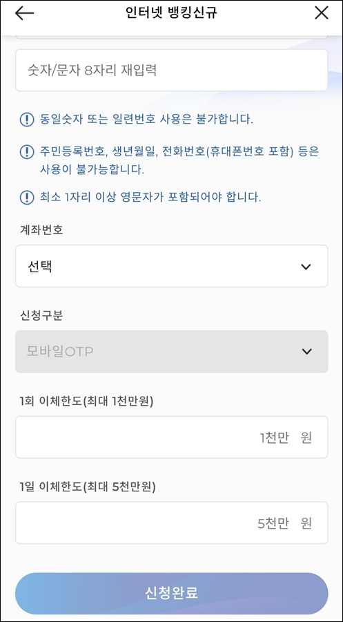 모바일 OTP 인증번호 6자리까지 입력하였다면 인터넷 뱅킹 신청은 완료됩니다.