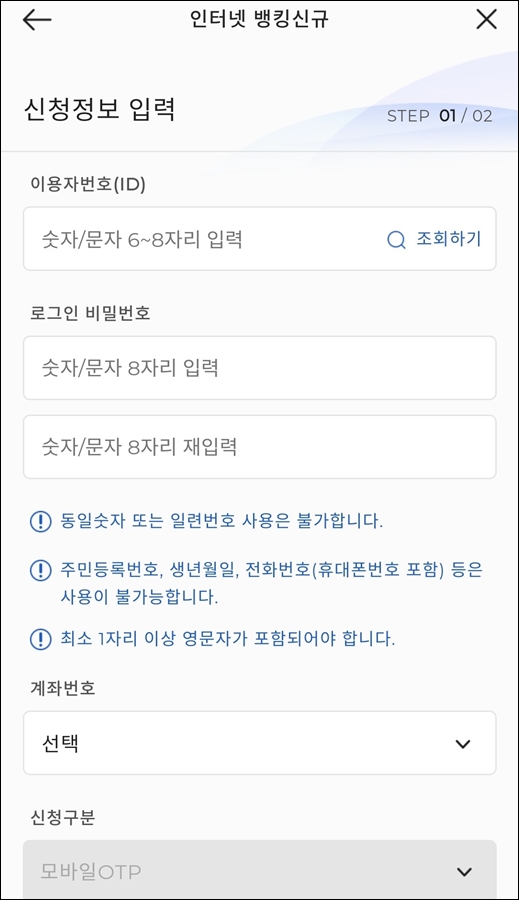 인터넷 뱅킹 신청하기 버튼을 선택하여 인터넷 뱅킹을 신청해봅니다.