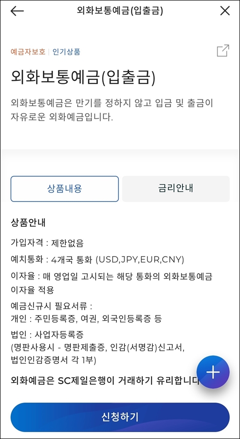 위와 같이 통장 개설에서 외화보통예금을 선택해주세요. 위와 같이 상품내용이 잘 나와있으니 확인하시고, 신청하기를 선택하여 진행해 봅니다.