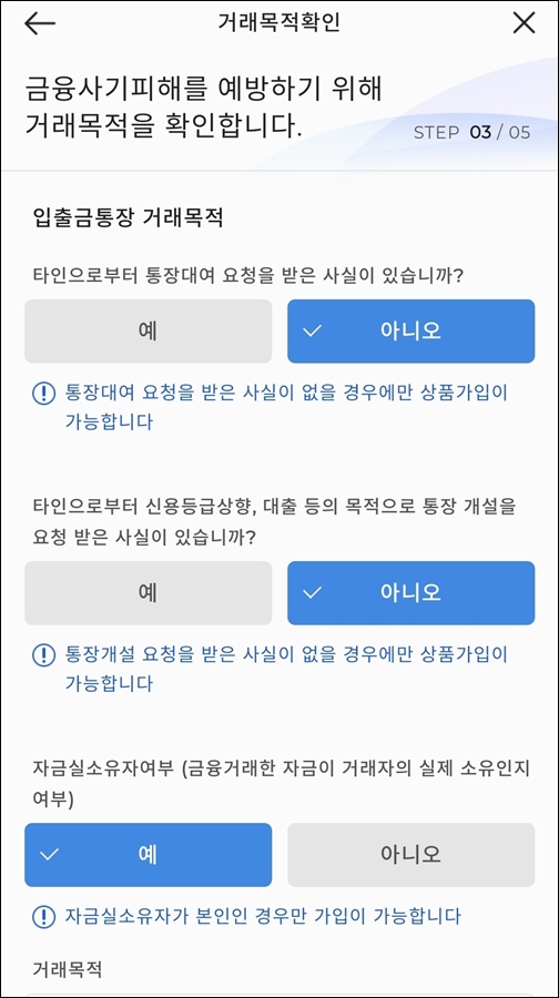 거래 목적을 잘 선택후 진행하시고요. 타행 계좌 인증이나 영상통화 인증으로 추가 인증까지 진행하시면 거의 마무리되어갑니다.