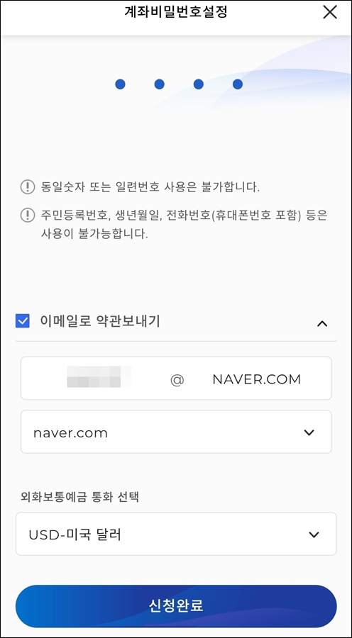 마지막으로 계좌 비밀번호 4자리까지 선택해주시고, 외화통장에서 사용할 기본 통화를 선택해주세요. 가장 많이 사용하는 USD 미국 달러로 선택하시면 되겠습니다.