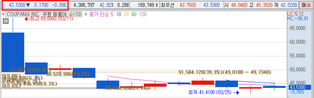 이 시점에서 쿠팡의 현재 주가 동향을 잠깐 살펴보면,