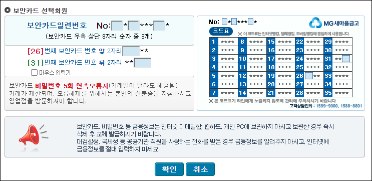 최종적으로 새마을금고 보안카드를 활용하여 위에서 요구하는 숫자 정보를 입력해주면 인증이 완료됩니다.