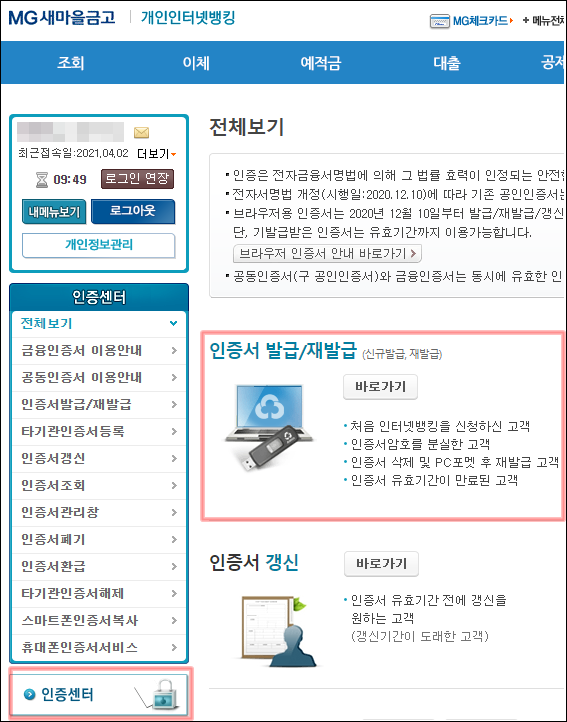 이번시간에는 아래와 같이 MG 새마을금고를 사용하는 분들을 위해서 금융인증서를 발급받아보도록 하겠습니다.