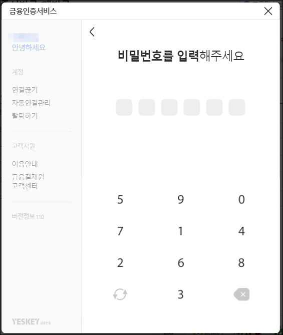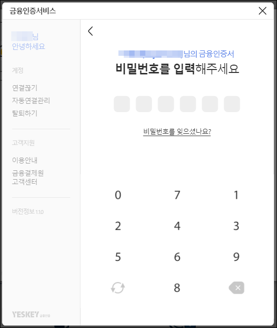 비밀번호는 공동 인증서 10자리와 달리 금융인증서는 6자리 숫자만 입력하면 되니 편리합니다.