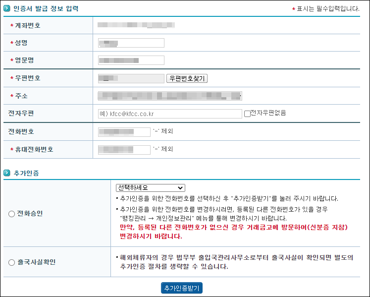 기존 정보를 다 입력하였다면 추가 인증 절차를 거치게 되는데, 국내에 계신경우 전화승인을 통해 인증을 받으면 되겠습니다.