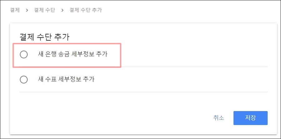 결제 수단 추가 방법 중 은행 송금 정보와 수표 세부 정보가 있는데, 이번에 SC제일은행 외화통장을 개설하였으니 첫번째 메뉴인 새은행 송금 세부정보 추가를 선택한 후 "저장" 버튼을 선택하도록 합니다.