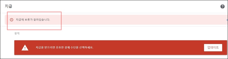 바로 위와 같이 "지급에 보류가 걸려있습니다." 라는 문구가 보이고 바로 아래에는 "지급을 받으려면 유효한 결제수단을 선택하세요"라는 상세 내용을 보여주고 있습니다.