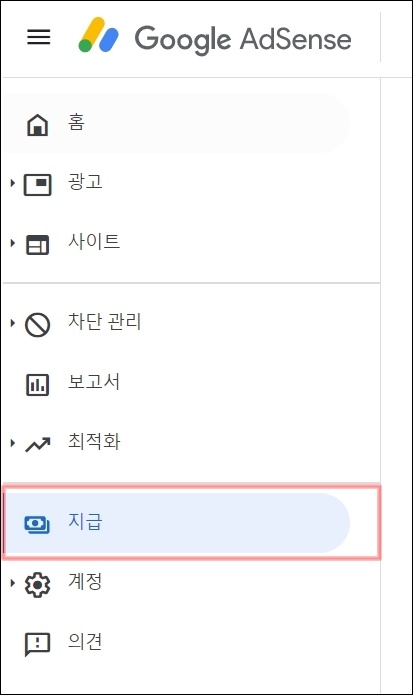애드센스 홈페이지 좌측에 메뉴 중에 "지급"이라고 표시된 메뉴가 보이시나요? 이 메뉴를 접속해서 들어가 봅니다.