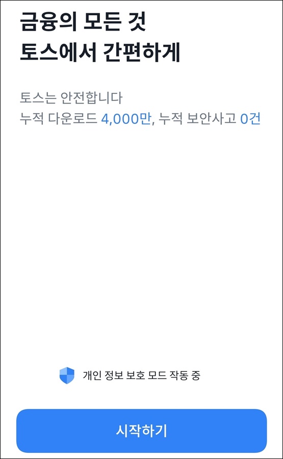 아래와 같이 다운로드 완료 후 처음 실행하면 토스 시작하기 화면을 보실 수 있습니다. 간단히 정보를 기입하고 가입을 진행해 봅니다.