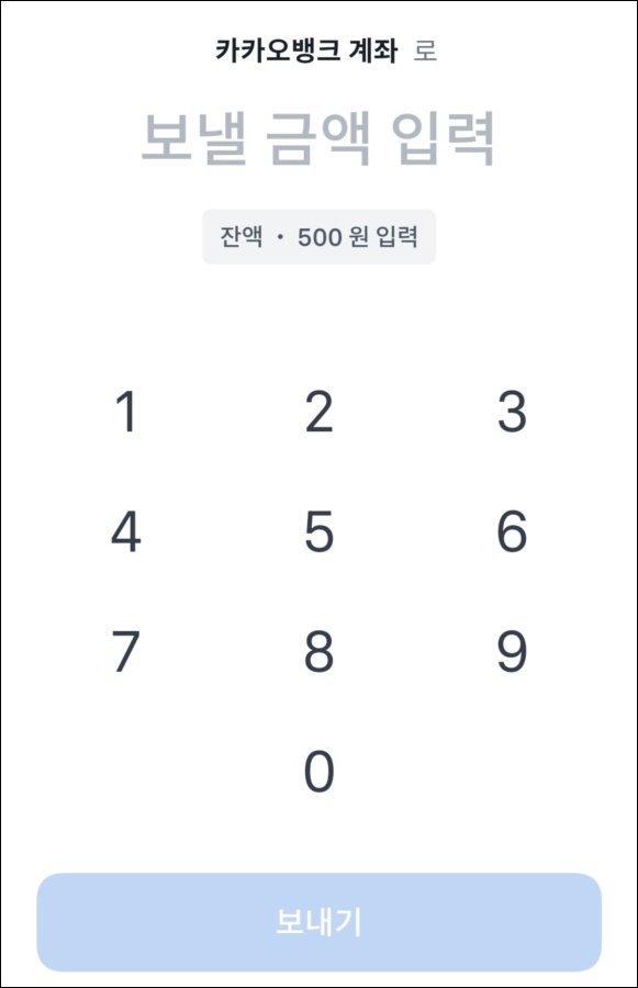 카카오뱅크 계좌를 선택한 후 보낼 금액을 선택해봅니다. 500원 입금되었으니 모두 다 계좌이체를 해보도록 합니다.