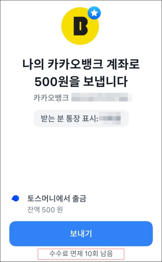 500원 선택하고 나서 보내기를 선택하니 받을 계좌와 함께 " 수수료 면제 10회 남음"이라는 문구도 보입니다.
