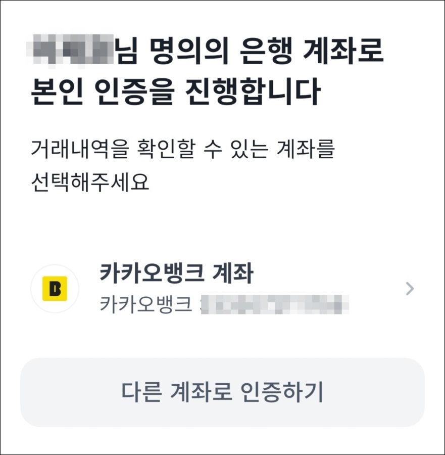 인증이 완료되면 오른쪽 화면과 같이 타 은행으로 거래 내역 인증 절차를 거치게 되는데, 기존에 등록한 계좌가 보이실 겁니다. 이 계좌를 선택하거나 다른 계좌를 선택하면 그 계좌로 1원이 들어오면서 인증이 마쳐집니다.