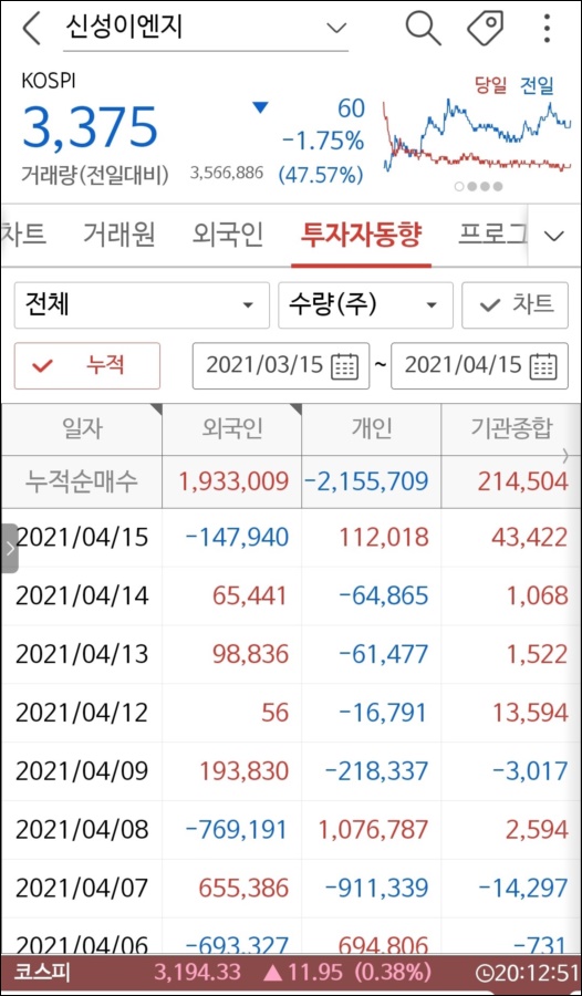 위 내용은 한국투자증권 어플에서 좀 더 상세하게 기관/외인 수급상황을 살펴봤는데, 나쁘지 않은 거 같습니다. 지속적으로 매수가 들어오고 있는 거 같네요.