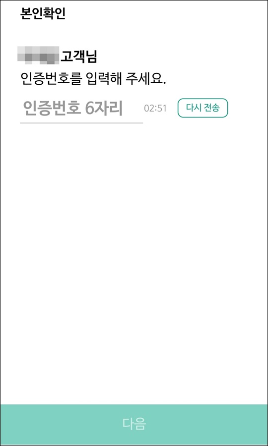 사용하는 스마트폰으로 휴대전화 인증단계를 거치고, 문자로 날라온 6자리의 인증 번호를 우측 화면에 입력을 해줍니다.