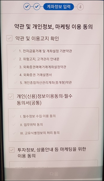 계좌 정보를 입력하는 단계입니다. 전자 금융 거래 및 개인 정비 이용 등 관련 약관을 간단히 확인한 후 다음 버튼을 선택하도록 합니다.