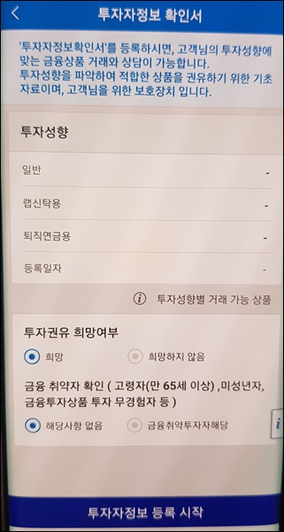 이제 투자자의 성향을 확인하는 투자자 정보를 확인하는 단계를 진행하게 됩니다. 투자 가능 기간이 얼마나 되는지, 투자 경험은 어떻게 되는지, 투자 지식은 수준이 어떤지 등 확인을 하니 본인에게 맞는 내용을 입력하고 진행을 하도록 합니다.