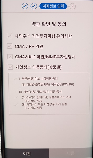 주식, CMA, 연금저축 등 증권 계좌 개설과 관련된 약관에 동의를 확인하는 화면입니다. 하나씩 하나씩 체크해가면서 확인을 하고, 그다음 단계로 진행합니다.
