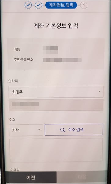 계좌 기본 정보를 위해 본인의 성명, 주민등록 정보 및 스마트폰, 주소까지 확인하면 되겠습니다.