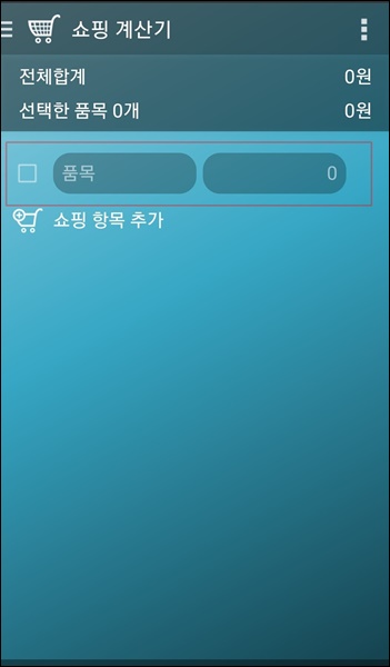 위와 같이 쇼핑할 품목을 "품목"란에 입력을 하고 오른쪽에는 가격표의 금액을 입력합니다.