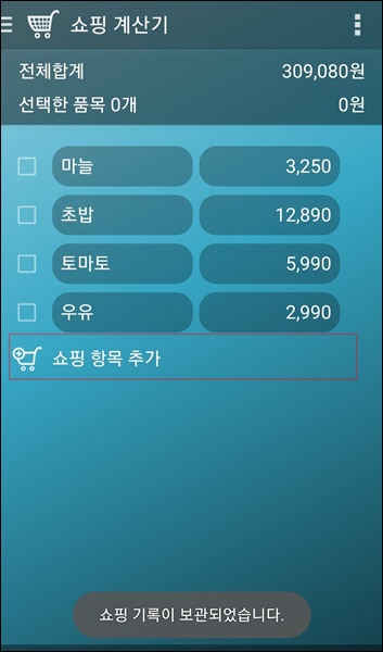 쇼핑할 품목을 다 입력해 놓았다면 위와 같이 메뉴 버튼을 선택 시 쇼핑 기록을 보관할 수 있습니다.