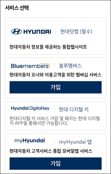 그러고 나서 우측과 같이 해당 서비스를 고르면 되는데, 필수로 선택해야 되는 현대 닷컴을 선택해주도록 합니다.