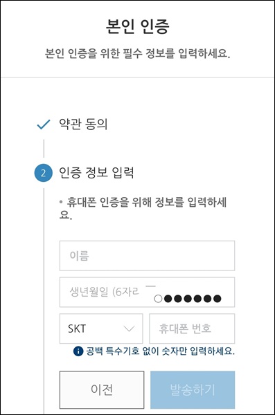 오른쪽과 같이 휴대폰 인증을 통해 안내되는 인증번호를 입력하면 간단히 본인 인증은 완료가 됩니다.