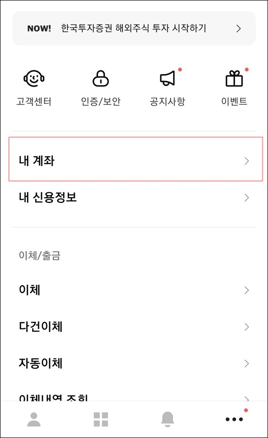 카카오 뱅크에 접속을 하셨다면 메인 메뉴 중에서 내 계좌를 먼저 선택해주세요.