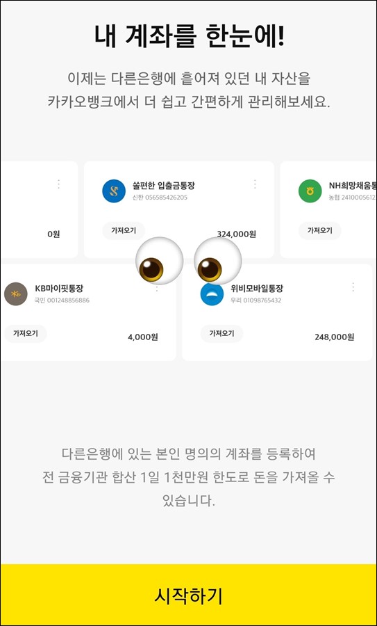 이 모든 계좌를 카카오 뱅크에 등록해 놓는다면 다른 은행의 예금까지 모두 관리가 가능한 강력한 기능이 될 거 같습니다.
