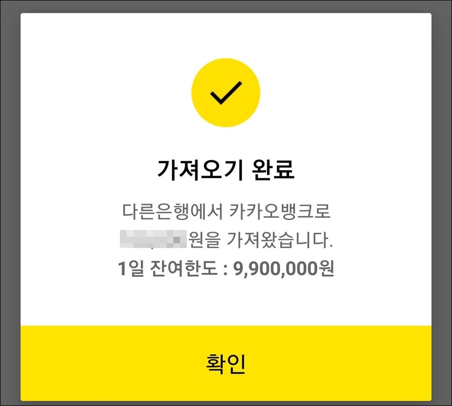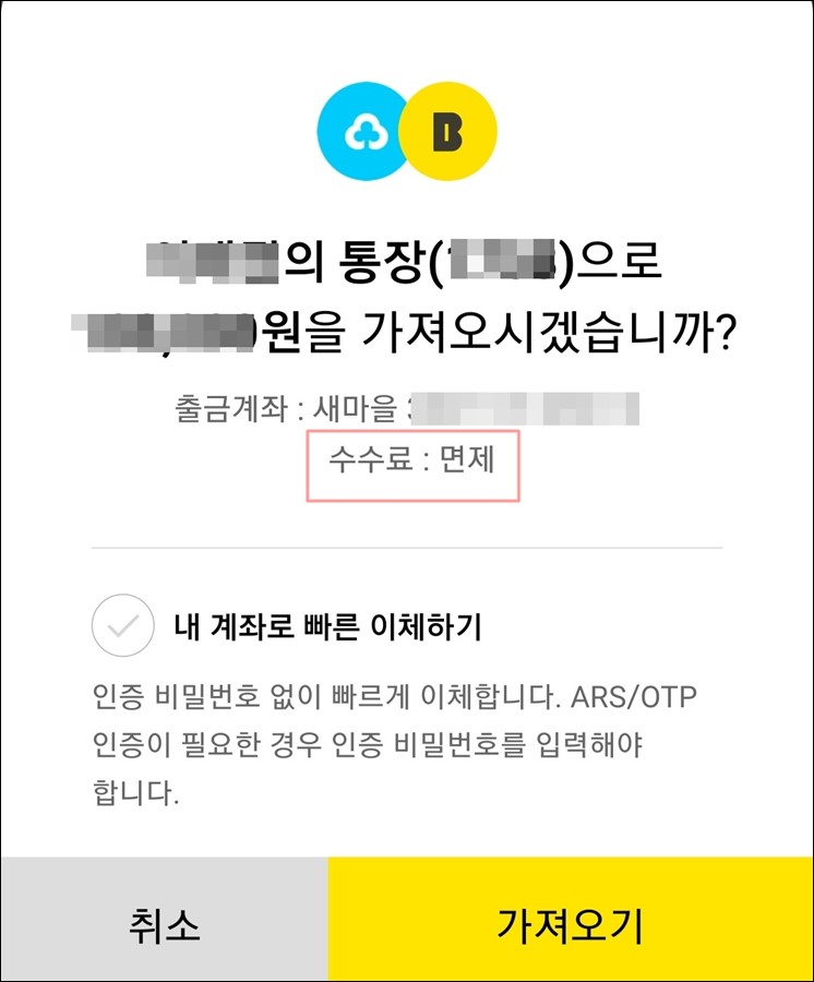 가져오기를 선택하면 타 은행에서 수수료 없이 카카오 뱅크로 이체를 해오게 됩니다.