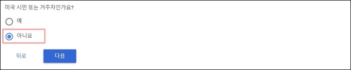 미국 시민이 아니므로 아니요를 선택한 후 넘어가 주시고요.