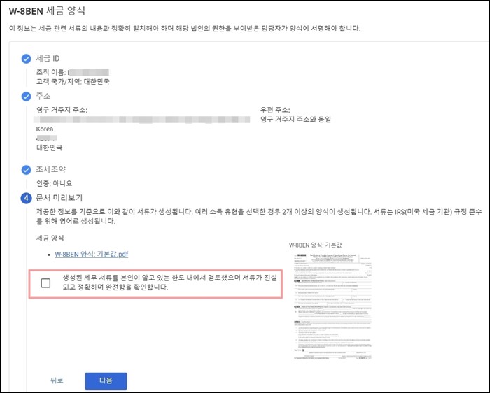 입력이 모두 완료되었다면 위와 같이 세금정보가 정확하게 입력되었는지 확인 요청 화면이 나옵니다. 위와 같이 PDF 파일의 세금정보를 잘 확인해주시고, 수정 필요사항이 있으면 뒤로 가기 버튼을 눌러서 수정하고, 맞으면 위 체크박스를 선택한 후 다음 단계로 넘어가 봅니다.