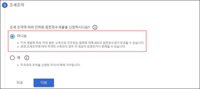 이제 조세조약과 관련된 부분인데요. 사업자등록자가 아닌 개인이라면 "아니요"를 선택해서 미국 내에서 발생된 수익에 대한 30%의 세금만 부과하면 됩니다.