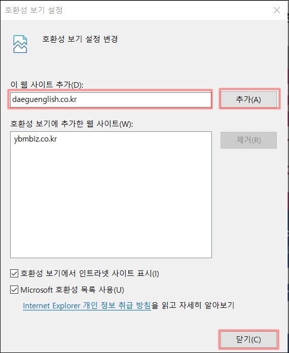 그러면 아래 네모박스에 해당 홈페이지가 추가가 됩니다. 이후 닫기 버튼을 누르시고 인터넷 익스플로러를 새로고침 해주시거나, 익스플로러를 껐다가 다 시켜주시면 됩니다.