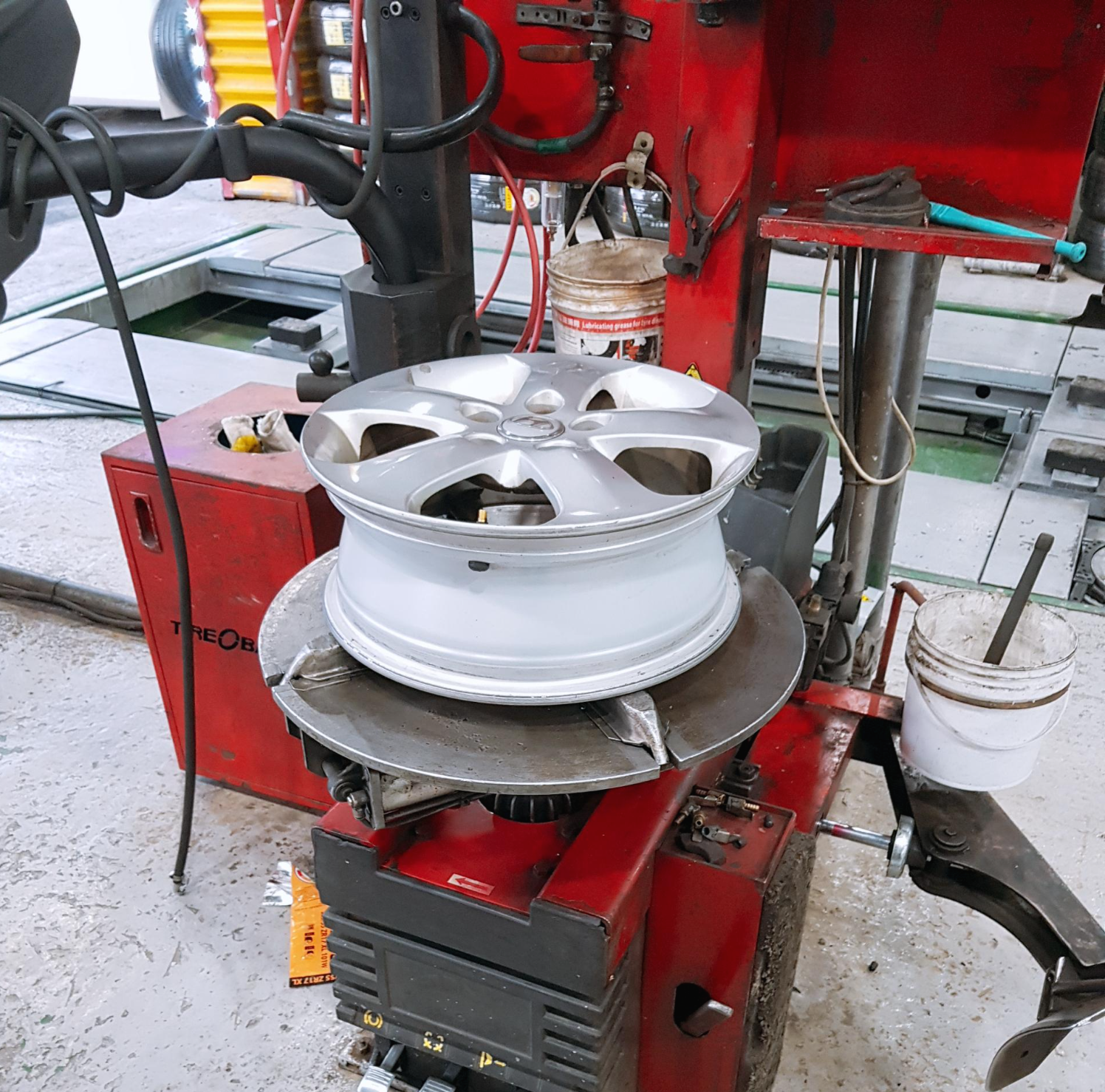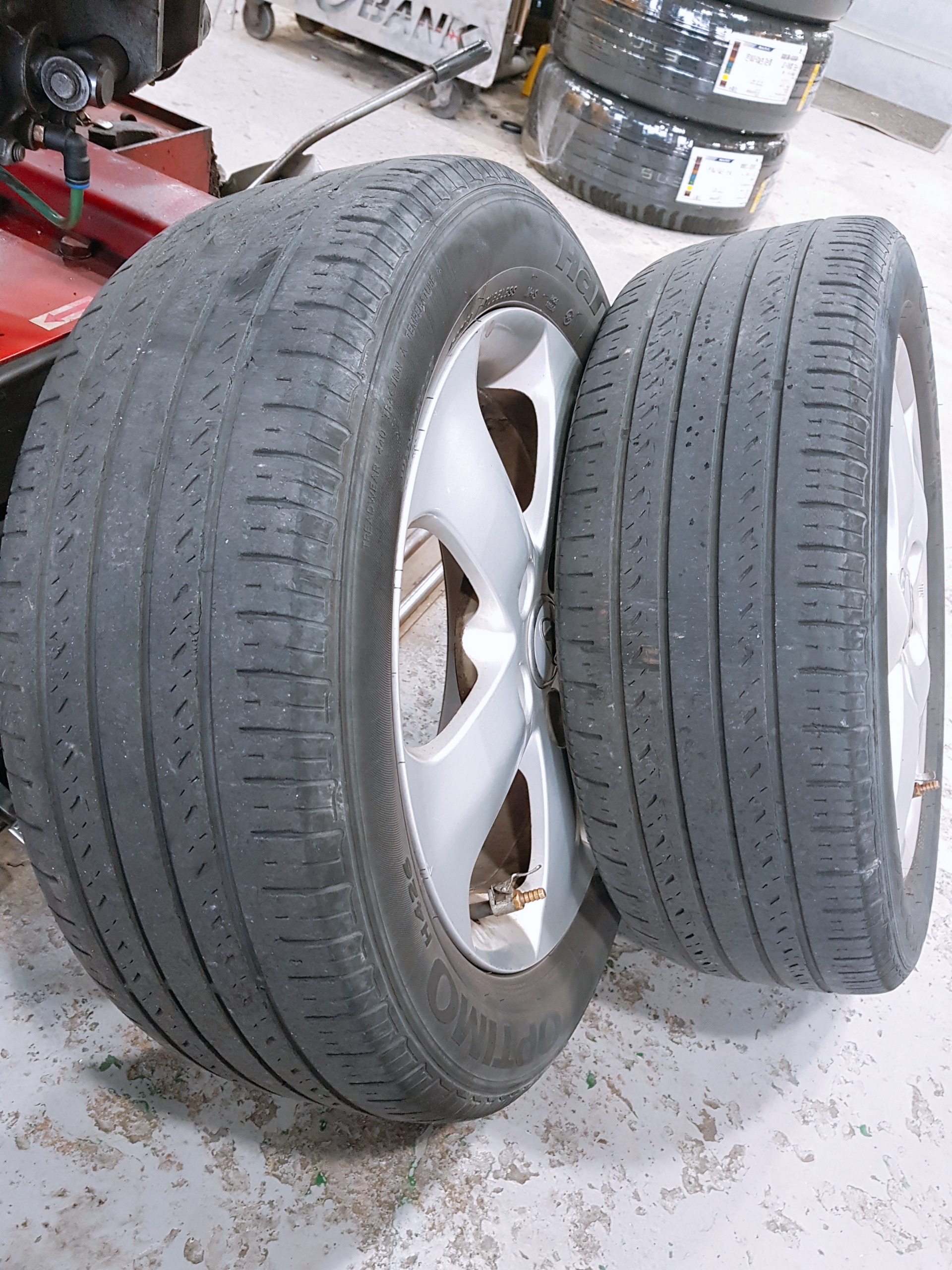 타이어에 공기 주입이 다 끝난 후 휠 밸런스를 잡아주는 기계로 휠의 균형을 맞춰주시더라고요. 휠의 균형을 맞추기 위해서 작은 철(?) 조각들을 이용해서 바퀴의 균형을 잡아주더군요.