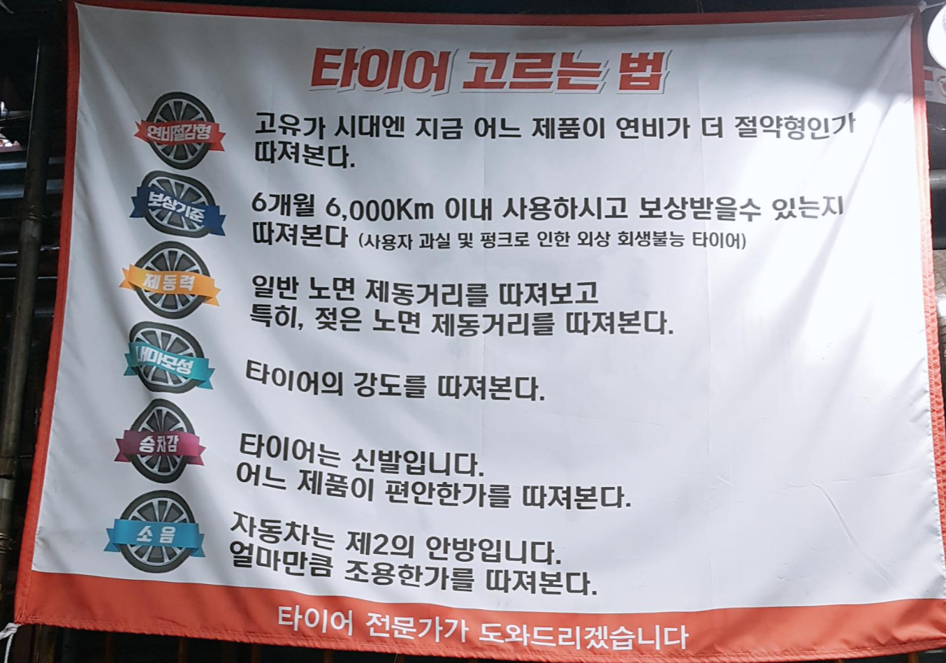 타이어를 잘 고르는 방법에 대한 안내문이 크게 걸려있더라고요. 타이어 고를 때 참고해서 고르면 좋을 거 같습니다. 그런데 결국 좋고 비싼 타이어는 위의 성능을 좀 더 좋을 거고, 저렴한 타이어는 좋은 타이어보다는 한 단계 아래겠죠?