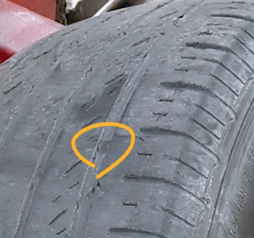 타이어가 많이 마모된 모습이 보이죠... 타이어 한계선 표시까지 많이 닳아 버렸네요. 타이어는 신발과 같으니 잘 바꿔줘야 함을 다시 한번 느낍니다.