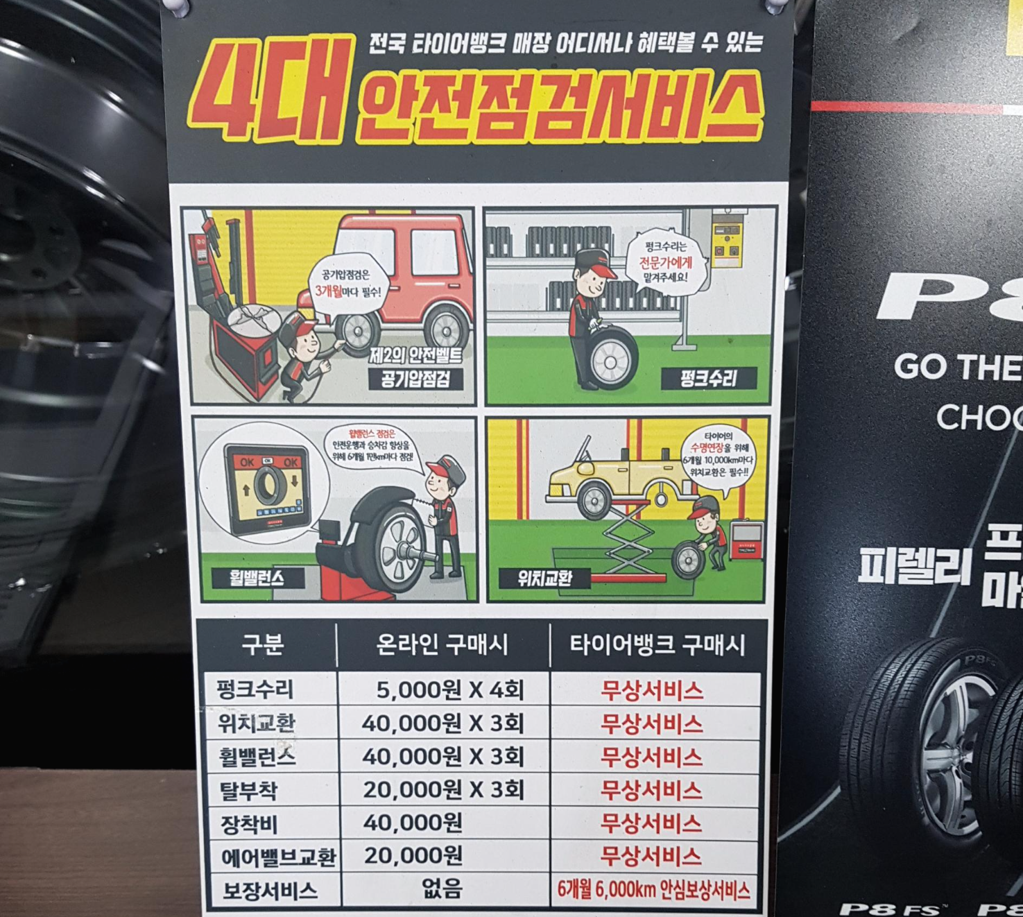 타이어 교체를 완료하고 나서 주변에 보니 타이어 뱅크의 4대 안전 점검 서비스가 눈의 띄네요. 아까 얘기한 것처럼 타이어를 온라인에서 구매해도 되지만 타이어 뱅크에서 직접 구매하면 위와 같은 혜택이 있다고 하니 장단점이 있는 것 같습니다.