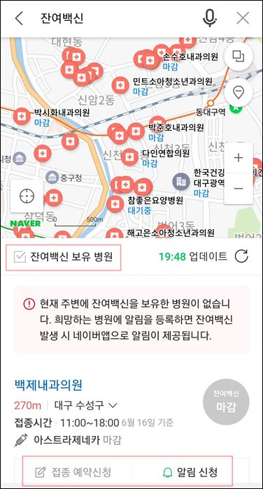 나중에 잔여 백신이 생겼을 때 알림을 받고 싶다면 알림 신청을 해두셔도 되겠습니다.