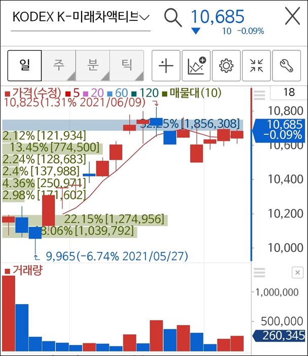 현재 최저가인 9965원을 기준으로 보면 약 7% 정도의 수익률을 나타내고 있음을 볼 수 있습니다.