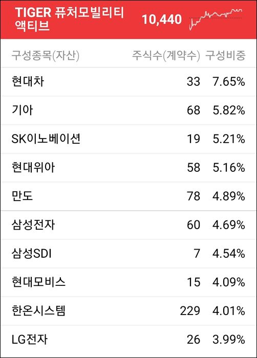 미래에셋의 TIGER퓨처 모빌리티 액티브 ETF와 유사한 면도 있으면서 다른 부분도 있으니 어떤 종목이 있나 살펴보시죠.