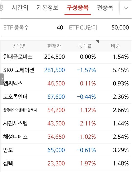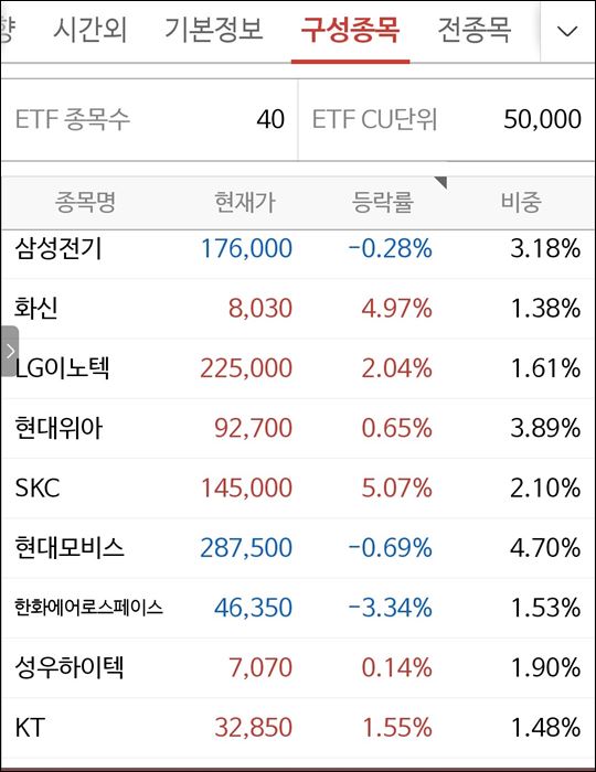 구성종목을 살펴보면 현재는 총 40종의 종목에 투자를 하고 있습니다.