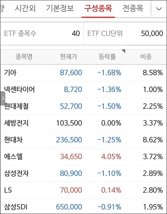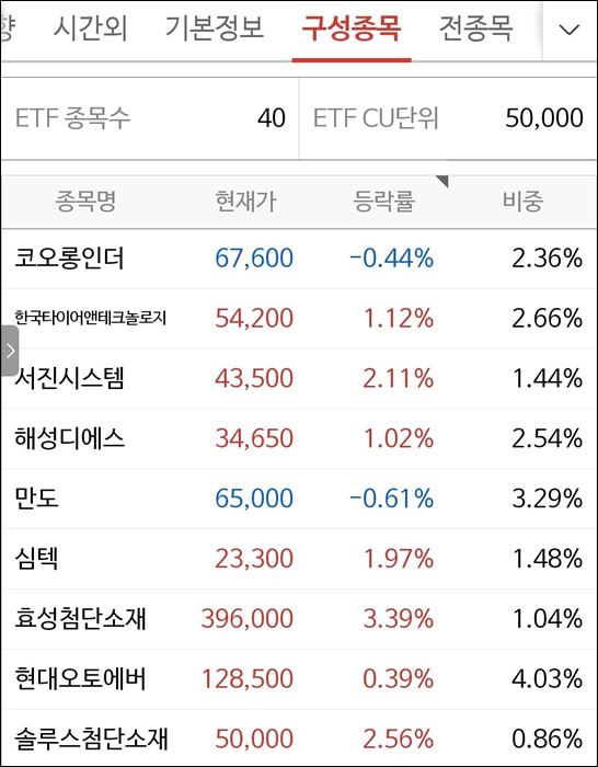 그다음 비중으로는 삼성증권 ETF는 현대 모비스, 현대 위아 비 중순으로 있으나 미래에셋 증권 ETF는 현대 위아, 현대 모비스 순으로 투자 비중이 다릅니다.